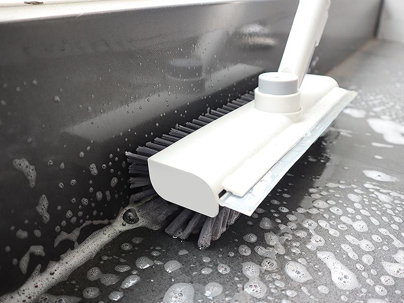 The side of the floor brush is made of the same material as the bottom, forming a right angle with the ground. This design allows for easy removal of stubborn stains on walls and corners, leaving no residue behind. It ensures that no dirt or grime can be left lingering after cleaning.