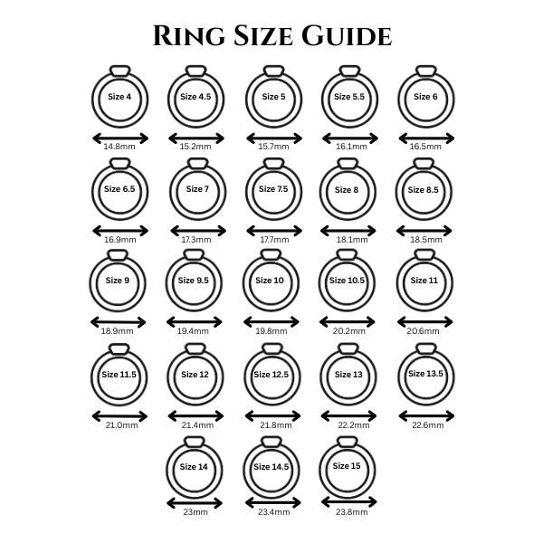 Available in US ring sizes 4 to 15, including half sizes. Not adjustable; double-check your size before ordering.